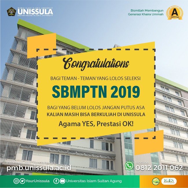Selamat ya bagi yang dilolos seleksi SBMPTN 2019, bagi yang belum beruntung jangan khawatir, masih banyak jalan lain untuk menuntut ilmu. Salah satunya di Universitas Islam Sultan Agung (Unissula) Semarang yang sudah terakreditasi A. Raih juga berbagai program beasiswa menarik. informasi dan pendafaran bisa klik https://pmb.unissula.ac.id .